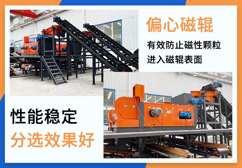 偏心渦電流分選機(jī)采用一體化的設(shè)計(jì)理念,將振動給料機(jī)、磁輥、磁滾筒、輸送皮帶機(jī)、渦電流分選主機(jī)集成于一體,可以減少設(shè)備總體積。設(shè)備前端,通過磁選原理,去除物料中夾雜的鐵質(zhì);設(shè)備后端,通過渦電流原理,將物料中的銅鋁等有色金屬雜質(zhì)通過作用力彈射出來,最終達(dá)到分離鐵質(zhì),有色金屬,和其它物料的效果。